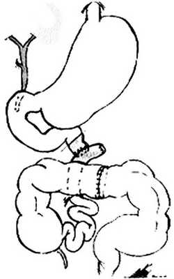 Опухоль удалена единым блоком вместе с петлями тонкой и тощей кишки, большим сальником, частью поперечной ободочной и селезеночным углом толстой кишки, селезенкой. Кроме того, в связи с наличием конкрементов в желчном пузыре выполнена холецистэктомия. Наложены анастомозы: тонко-тонкокишечный конец в бок на уровне связки Трейтца и асцендо-десцендо конец в конец (см. рис. 1, б). Рисунок 1. Схема операции. б - реконструкция кишечника.