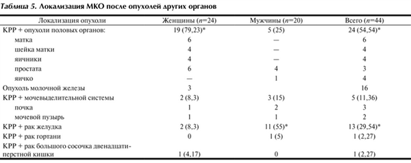 Если КРР выявлялся одновременно с опухолями других органов, то средний возраст больных (67,1 года) был на 4,2 года больше, чем при выявлении синхронного КРР, а женщины при выявлении опухолей на 7 лет моложе мужчин. Синхронные колоректальные опухоли у женщин чаще сочетались с раком молочной железы, у мужчин - с раком почки. Выявление колоректальной опухоли после лечения опухоли другой локализации наблюдается примерно в том же возрасте, что и синхронное (65,1 года), но несколько чаще, чем их одновременное выявление (62,86%). МКО у мужчин выявлялась в среднем через 4,4 г, чаще после лечения рака желудка (55%). У женщин колоректальная опухоль выявлялась в среднем через 5,7 года, преимущественно после лечения опухолей половых органов (79,17%).