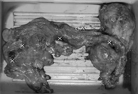 Макроскопически: в слепой кишке в 5 см от баугиниевой заслонки блюдцеобразная опухоль диаметром 3 см с язвой, в 6 см проксимальнее анастомоза опухоль диаметром 4 см, в 9 см от края резекции опухоль размером 8×7,5×7 см, прорастающая все слои стенки кишки, околопочечную клетчатку, капсулу почки. На разрезе большая часть опухоли представлена сообщающимися между собой полостями, максимально до 5 см в диаметре (рис. 5). Рисунок 5. Препарат удаленной ободочной кишки (вскрыта продольно) единым блоком с левой почкой. Х - места рецидива опухоли, СА - старый анастомоз. Внутренняя поверхность полостей выстлана мягкими розоватыми слизистоподобными структурами. Микроскопически: во всех очагах опухоли картина слизистого рака с поражением всех слоев стенки кишки.