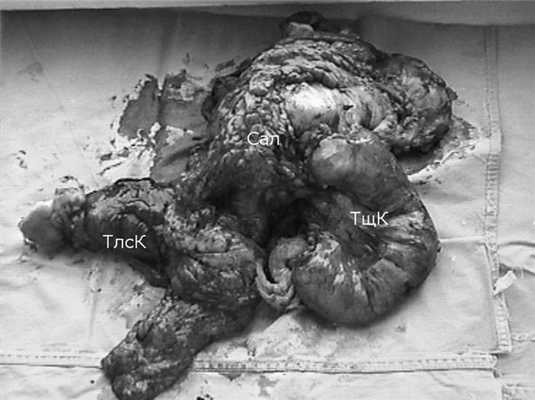 Макроскопически: опухоль располагалась в центре резецированного участка толстой кишки, граница между стенкой кишки и опухолью четкая как с проксимального, так и с дистального конца (рис. 2). Рисунок 2. Препарат: удаленная опухоль с резецированными петлями тощей кишки (ТщК), толстой кишки (ТлсК) и большим сальником (Сал). На участке около 12 см стенка кишки резко утолщена (до 2 см), хрящевой плотности, на разрезе белого цвета, полупрозрачная. Дно опухоли неровное, выстлано свертками крови. Со стенкой кишки в области опухолевого перерождения были спаяны большой сальник и петля подвздошной кишки, на ограниченном участке - селезенка.
