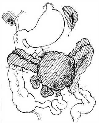 (рис. 1, а). Рисунок 1. Схема операции. а - штриховкой обозначены границы резекции органов.
