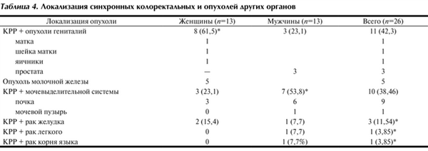 Локализация синхронных первично-множественных опухолей представлена в табл. 4, из которой видно, что синхронные колоректальные опухоли у женщин чаще сочетались с опухолями гениталий - у 8 (61,5%), причем у 5 - с раком молочной железы. У половины 7 (53,8%) мужчин синхронный КРР сочетался с опухолями мочевыделительной системы, причем у 6 из них - с раком почки.
