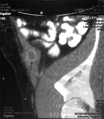 При ультразвуковом исследовании брюшной полости в правой подвздошной ямке определяется изоэхогенное образование 8х4 см с гипоэхогенными включениями, окруженное капсулой; определение экстра- или интраперитонеальной локализации образования оказалось затруднительным. При компьютерной томографии брюшной полости в правой подвздошной области, в тканях передней брюшной стенки наиболее вероятно - предбрюшинно определяется объемное образование 8,0х4,5 см с капсулой и очагами пониженной плотности. Клинический диагноз: Абсцедирующая гранулема послеоперационного рубца передней брюшной стенки, состояние после аппендэктомии; Сorpus alienum-?