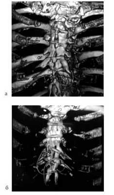 Следующий этап обработки - это сегментация 3D-серошкального изображения, которая заключается в выделении определенных областей по однородности каких-либо их характеристик и построении поверхностей этих областей. Такое сегментированное 3D-изображение по сути является анатомической моделью исследуемой области. Следовательно, абстракция изображения достигается за счет получения численных значений характеристик визуализируемых тканей - построения объемных анатомических моделей исследуемых органов и структур тела человека (рис. 2). Рисунок 2. Мультиспиральные компьютерные томограммы с 3D-реконструкцией (больная Г., 57 лет). а - вид грудной клетки спереди. В нижней трети грудины - витки тонкой проволоки (электрода), «ныряющего» загрудинно; б - вид передней грудной стенки сзади. Загрудинное расположение проволочного электрода.