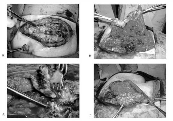 После прокрашивания свищей раствором метиленового синего выполнен окаймляющий разрез свищевого отверстия с иссечением старого послеоперационного рубца по средней линии грудины от яремной вырезки до мечевидного отростка. Отмечена обильная фиксация раствора красителя в нижней трети грудины - проекции мечевидного отростка. Поочередно выделены и удалены 5 стальных лигатур, которые в проекции III, V ребер поддерживали воспаление. В воспалительном инфильтрате выявлен предгрудинный фрагмент сердечного электрода, «уходящего» в толщу нижней трети тела грудины (рис. 4, а). Рисунок 4. Этапы операции. а - мобилизованы мягкие ткани передней грудной стенки. Выявлен фрагмент сердечного электрода, «уходящего» в толщу нижней трети тела грудины. Нижняя треть грудины, мечевидный отросток поражены деструктивным процессом; б - поперечно рассечена грудина на уровне четвертого межреберья, пересечены хрящи V-VI-VII ребер с обеих сторон, начата мобилизация грудины; в - большая грудная мышца мобилизована с сохранением сосудистой ножки; г - лоскут перемещен в область дефекта на грудной стенке, фиксирован отдельными узловыми швами. В остальных отделах грудина консолидирована, без признаков воспаления, что соответствует картине лучевой диагностики. Решено выполнить резекцию измененных тканей единым блоком с резекцией нижней трети грудины, мечевидного отростка, хрящей V-VI-VII ребер с обеих сторон. На уровне четвертого межреберья поперечно рассечена грудина, пересечены хрящи V-VI-VII ребер с обеих сторон, начата мобилизация фрагмента грудины единым блоком от нижнего края (рис. 4, б). В момент мобилизации нижней трети грудины из загрудинного пространства развилось массивное венозное кровотечение из правого предсердия, вовлеченного в рубцовый деструктивный процесс. Остановка кровотечения прижатием. Резекция завершена. С целью устранения предполагаемого дефекта предсердия на ретростернальную фасцию поочередно наложены 4 шва от периферии к центру дефекта, отмечено снижение интенсивности поступления крови. Из подкожной жировой клетчатки выкроен лоскут размером 2,5×3,5 см, плотно прижат к дефекту, ранее наложенные швы затянуты - кровотечение остановлено. Поверх ушитого дефекта уложена гемостатическая губка (рис. 4, в). С целью дополнительного укрепления гемостатического шва и устранения послеоперационного дефекта передней грудной стенки решено выполнить торакомиопластику с использованием большой грудной мышцы на сосудистой ножке. Отпрепарована кверху и латерально левая молочная железа, БГМ широко мобилизована с выделением сосудистой ножки. Лоскут перемещен в область дефекта на грудной стенке, фиксирован отдельными узловыми швами (рис. 4, г). Левая молочная железа фиксирована к передней грудной стенке отдельными узловыми швами. Ложе большой грудной мышцы и область перемещенного мышечного лоскута дренированы отдельными силиконовыми дренажами, выведенными через отдельные разрезы. Отдельные швы на подкожную жировую клетчатку, швы на кожу. Асептическая наклейка. Кровопотеря составила 1200 мл.
