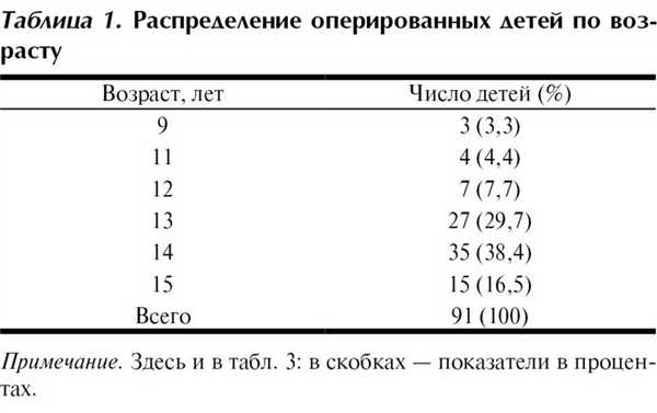 В ДГКБ №13 им. Н.Ф. Филатова с 1994 по 2009 г. оперирован 91 ребенок с КДГК. Мальчиков было 76 (83,5%), девочек - 15 (16,5%). Все дети оперированы в возрасте 9-15 лет, когда деформация грудной клетки имела выраженный характер (табл. 1).