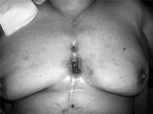 Больная Г., 57 лет, поступила с жалобами на наличие наружных свищей на передней грудной стенке с гнойным отделяемым. Из анамнеза известно, что 8 мес назад она перенесла операцию прямой реваскуляризации миокарда (МКШ, АКШ). Длительность заболевания ишемической болезнью сердца 6 лет (с 2004 г.). Через 3 мес после операции на передней грудной стенке появились наружные свищи с гнойным отделяемым. Консервативное лечение не дало эффекта. Госпитализирована в Институт хирургии им. А.В. Вишневского.