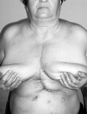 Послеоперационный период протекал соответственно тяжести перенесенного вмешательства. Перевязки с ревизией раны под внутривенным наркозом. В реанимационном отделении больная провела 5 койко-дней. В полном объеме проводили антибактериальную, симптоматическую, заместительную, гемотрансфузионную терапию. Дренажи удалены на 5-е и 6-е сутки. На 7-е сутки медиальный угол кожного лоскута частично некротизирован, в связи с чем рана в данном участке разведена, что потребовало в течение 32 сут местного лечения с применением антисептических мазей, растворов. Общее состояние больной сохранялось удовлетворительным. На фоне проводимого лечения достигнута вторая фаза раневого процесса, в ране появились активные грануляции. На 34-е сутки выполнен заключительный этап - пластика гранулирующей раны передней грудной стенки местными тканями. В дальнейшем послеоперационный период протекал без осложнений. Пациентка выписана в удовлетворительном состоянии на 15-е сутки после операции (рис. 5). Рисунок 5. Вид больной через 4 мес после операции. Продолжительность госпитализации составила 62 койко-дня.