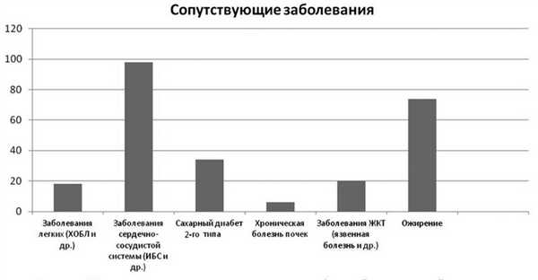 Сопутствующие заболевания различной степени тяжести были выявлены у всех пациентов, вошедших в исследование. Два сопутствующих заболевания и более выявлены у 54 пациентов из 100. Распределение наиболее частых сопутствующих заболеваний среди пациентов по органам и системам представлено на рис. 1. Рис. 1. Частота встречаемости основных сопутствующих заболеваний в анализируемой группе пациентов. Сахарный диабет 2-го типа диагностирован у 34 пациентов, заболевания сердца и сосудов (ИБС, гипертоническая болезнь, приобретенные пороки клапанов сердца и др.) у 98, ХОБЛ — у 18 пациентов, различные заболевания верхних отделов ЖКТ (хронический гастрит, язвенная болезнь и др.) — у 20 пациентов из 10. Индекс массы тела выше 25 был у 74 пациентов из 100.