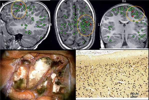 в — результаты локализации источников эпилептиформной активности во сне по данным магнитоэнцефалографии. Зелеными точками отмечены источники интериктальных разрядов как одиночных, так и входящих в состав длительных последовательностей, красными — источники начала длительных последовательностей разрядов, на фоне которых у пациентки возникли два тонических приступа. Следует отметить, что эта же зона первой включалась в генерацию многочисленных и длительных интериктальных последовательностей без клинических проявлений; г — слева — вид операционной раны к моменту завершения субпиального опорожнения коры средней и медиальной лобных извилин кпереди от прецентральной борозды (кора нижней лобной извилины сохранена с учетом доминантности полушария); справа — иммуногистохимический препарат — видны выраженные нарушения корковой архитектоники по смешанному типу (экспрессия NeuN, ×100).