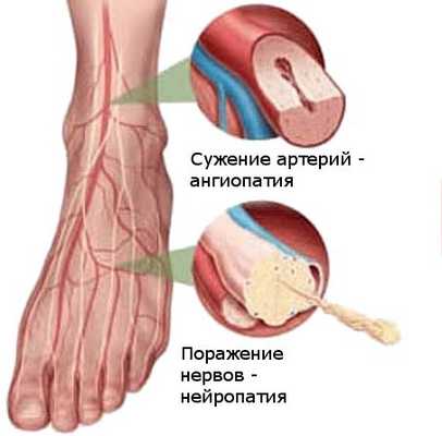 Макроангиопатия развивается в сосудах сердца и нижних конечностей, являясь по сути злокачественным атеросклерозом их.