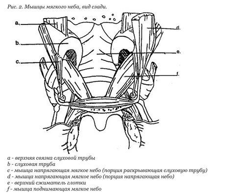 Когда слуховая труба раскрывается, по ней в полость среднего уха попадает воздух. Это выравнивает давление в полости среднего уха с атмосферным давлением, то есть происходит «вентиляция» среднего уха. Если среднее ухо вентилируется недостаточно, это приводит к скоплению жидкости (за счет возникающего разряжения), что может привести к инфекции. За правильное открытие слуховых труб отвечают мышцы мягкого неба (рис. 2).
