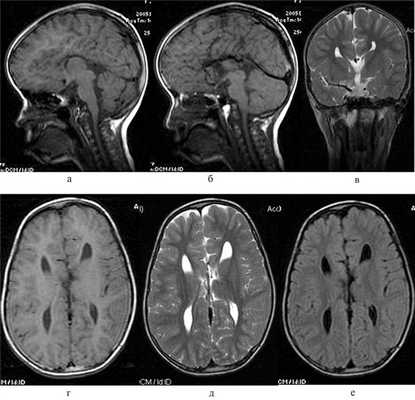Рис. 3. МРТ-картина аплазии мозолистого тела у девочки Р., 12 лет, с РН. На сагиттальных FSE Т1ВИ (а, б) мозолистое тело не дифференцируется, обращает внимание расширенное отверстие Можанди (а) при относительно сохранном объеме мозжечка; миндалины его незначительно опущены (б) — до входа в большое затылочное отверстие. При этом отмечается незначительное расширение межполушарной щели и типичная «бабочка» боковых желудочков на FSE Т2ВИ в коронарной проекции (в). На аксиальных FSE Т1ВИ (г) и ТЕ2ВИ (д), FLAIR Т2ВИ (е) вместо мозолистого тела видна несколько расширенная межполушарная щель с характерным для аплазии мозолистого тела изменением конфигурации желудочков.