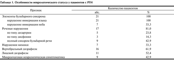У пациентов с РГН наиболее часто выявлялись элементы бульбарного, несколько реже — псевдобульбарного синдрома, нередки были признаки стволовой дисфункции, часто выявлялись признаки дизрафического статуса, в том числе вертебральные аномалии (табл. 1).