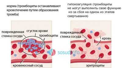 Нехватка активных форм прокоагулянтов обусловлена снижением количества или изменением качества тромбоцитов. Тромбоцитопатии в отличии от тромбоцитопений характеризуются деструкцией и дисфункцией клеток, нарушением в них биохимических процессов. Пониженная свертываемость крови — результат недостаточного синтеза прокоагулянтов в печени или их слабой активации при сохранении количественных показателей. Также на процесс коагуляции оказывается влияние гиперактивация фибринолитической системы и противосвертывающих факторов.