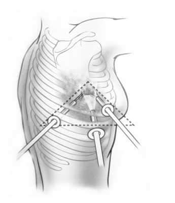 Для осуществления биопсии легкого выполняют 3 разреза в форме треугольника, а при необходимости еще один разрез, для последующего введения дренажной трубки