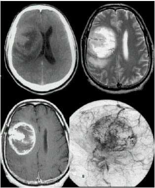 Глиобластома - наиболее злокачественная и агрессивно растущая из всех глиальных опухолей, является самой частой первичной опухолью ЦНС. Мужчины заболевают примерно в полтора раза чаще, чем женщины. Макроскопически опухоль представляет собой образование гетерогенной структуры с центральными или множественными очагами некрозаа, часто наблюдаются внутриопухолевые кровоизлияния. При гистологическом исследовании определяется резко выраженная атипия клеток с высокой митотической активностью. Четкой границы между опухолью, зоной отека и окружающей мозговой тканью нет. Симптомы повышения внутричерепного давления обычно быстро нарастают; типичны нарушения личности или появление выраженной очаговой симптоматики. Глиобластома чаще локализуется в глубинных отделах полушарий мозга с прорастанием в мозолистое тело с распространением на оба полушария в форме «бабочки». На КТ плотность опухоли весьма гетерогенна.