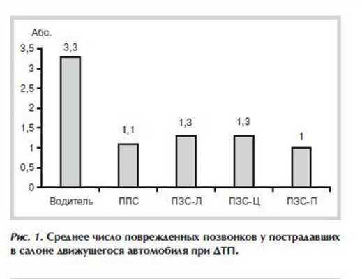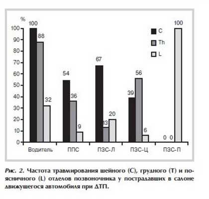 Анализ архивных актов и заключений за период с 2005 по 2012 г. показал, что в случаях смертельных травм внутри салона легкового автомобиля у водителя ТС преобладает частота переломов шейных, грудных и поясничных позвонков. У пассажиров переднего и заднего правого сидений такие повреждения выражены в минимальной степени.