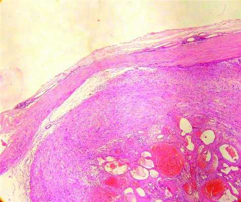 Опухоль представлена переплетающимися пучками рыхло расположенных клеток с округлым или вытянутой формы ядром, местами образующих ритмичные палисадообразные структуры, завихрения, тельца Верокаи (см. рис. 1, б). Рисунок 1. Рис. 1б. Гистологическая картина увеальной шванномы. Морфологическое строение опухоли. Окраска гематоксилином и эозином. Ув. 100. В центральном отделе опухоли имелся очаг ангиоматоза со старыми кровоизлияниями, очагами гиалиноза, небольшими внеклеточными отложениями гранул пигмента коричневого цвета (гемосидерин). Отмечена рассеянная лимфоцитарная инфильтрация. Довольно часто встречались крупные клетки с атипичными гиперхромными полиморфными ядрами. Митозы, некрозы отсутствовали. В области основания опухоли обнаружено резкое истончение склеры, участки ее разволокнения с формированием стафиломы (рис. 2). Рисунок 2. Рис. 2. Морфологическое строение стафиломы склеры. Окраска гематоксилином и эозином. Ув. 400. Выхода опухоли за пределы склеры в просмотренных срезах не было выявлено. Угол передней камеры был закрыт корнем радужки. Иридохрусталиковая диафрагма резко смещена кпереди.