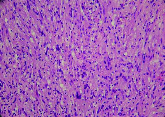 Наличие в опухоли эктазированных тромбированных сосудов с фиброзом и гиалинозом, рассеянной лимфоцитарной инфильтрации, а также участков дистрофии и клеток с крупными полиморфными гиперхромными ядрами свидетельствует о длительном существовании опухоли и при отсутствии митозов и некрозов не означает ее злокачественности (рис. 4). Рисунок 4. Рис. 4. Морфологическое строение участка опухоли с проявлениями клеточного полиморфизма при длительном существовании. Окраска гематоксилином и эозином. Ув. 400. Диагноз увеальной шванномы был подтвержден иммуногистохимическим исследованием, которое выявило положительную реакцию на протеин S-100, виментин и глиальный фибриллярный кислый белок.