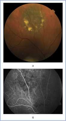 Рис. 7. Фотография (а) глазного дна и ФАГ (б) больной Л., 56 лет. Диагноз: начальная меланома.