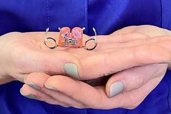 Несъёмная пластинка имеет небольшое пластмассовое основание, внутри которого встроен винт с максимальным потенциалом для расширения верхнего зубного ряда.