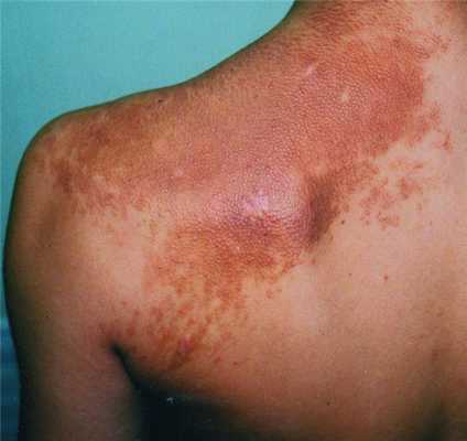 Мы наблюдали нескольких больных с НБ. Среди них был больной К., 11 лет, который предъявлял жалобы на гиперпигментацию участка кожи в области левой лопатки. Очаг коричневой окраски размером 2×2 см с сосочками на поверхности существовал с 3-месячного возраста, сопровождался слабым зудом. В последние 8—9 лет отмечалось увеличение размера очага и усиление зуда. Клинически предполагался диагноз фолликулярного муциноза. Данные гистологического исследования были в пользу этого диагноза. Повторно пациент обратился в 15 лет. Очаг на левой половине тела в это время был размером 30×20 см, захватывал область плеча, лопатки, надключичную область. На коричнево-красноватой коже имелись участки фолликулярного кератоза.