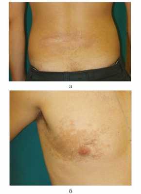 Еще 2 пациента, находившиеся на лечении в детском кожно-венерологическом отделении (ДКВО) ГКБ №14 им. В.Г. Короленко по поводу ограниченной склеродермии, имели НБ. Склеродермия у подростка (больной К.) возникла в 14 лет, когда НБ уже существовал на боковой поверхности грудной клетки справа (рис. 2, а), Рисунок 2. Больной К., 15 лет: ограниченная бляшечная склеродермия (а) и сопутствующий НБ (б). склеродермическая бляшка располагалась на спине (рис. 2, б).