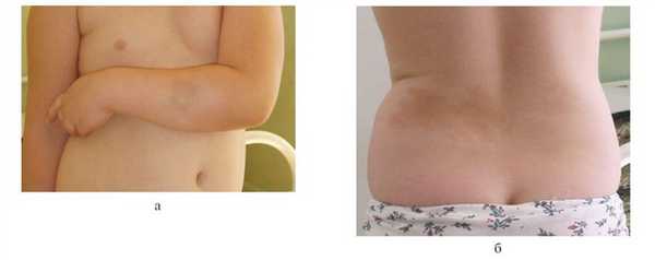У больной В., 5 лет, впервые проявления ограниченной склеродермии появились за 7 мес до поступления в ДКВО на коже левой верхней конечности (рис. 3, а), Рисунок 3. Больная В., 5 лет: бляшечная склеродермия на левом предплечье (а) и НБ, существующий с рождения (б). были представлены двумя очагами размером 4,5×4,5 см на предплечье и 3×4 см на тыльной стороне кисти. Цвет поражений - буроватый с синюшным оттенком. Вокруг очага на тыльной стороне кисти — розовато-лиловый венчик. На коже в области поясницы слева с рождения имелся очаг гиперпигментации размером 13×5 см с неровными очертаниями (рис. 3, б).