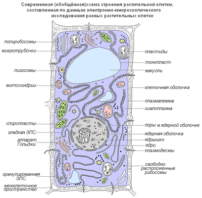 Рассмотрим клетку как структурно-функциональную единицу организма. Снаружи клетка покрыта плотной клеточной стенкой, в которой имеются более тонкие участки — поры. Под ней находится очень тонкая плёнка — мембрана, покрывающая содержимое клетки — цитоплазму. В цитоплазме есть полости — вакуоли, заполненные клеточным соком. В центре клетки или около клеточной стенки расположено плотное тельце — ядро с ядрышком. От цитоплазмы ядро отделено ядерной оболочкой. По всей цитоплазме распределены мелкие тельца — пластиды.