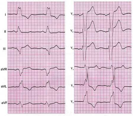 - Наличие деформированного продолжительного зубца S в отведениях V4-V6.