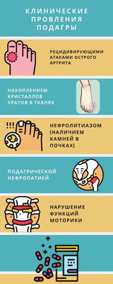 В клинической картине ведущими симптомами являются суставной и симптомы, связанные с поражением почек. Проявление заболевания характеризуется постоянно рецидивирующей картиной воспалительного процесса суставов. Специфическим признаком является образование подагрических узелков, так называемых тофусов, но они появляются уже на поздних стадиях.