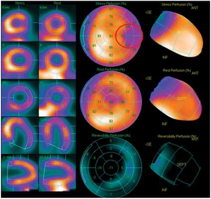 Рис. 5. Пример положительного результата ОФЭКТ миокарда (покой/нагрузка) у больного М., 55 лет с пограничным стенозом ОА. При нагрузке перфузия миокарда ухудшается, признаки преходящей ишемии миокарда (зона отмечена красным кругом) боковых сегментов миокарда ЛЖ (SSS=13, SRS=8, SDS=5).