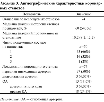 Таблица 3. Ангиографические характеристики коронарных стенозов Примечание. ОА — огибающая артерия.