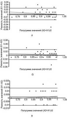 Рис. 3. Графики Бленда—Альтмана, демонстрирующие воспроизводимость метода МРК. а — сравнение значений МРК-1 и МРК-2; б — сравнение значений МРК-1 и МРК-3; в — сравнение значений МРК-2 и МРК-3.