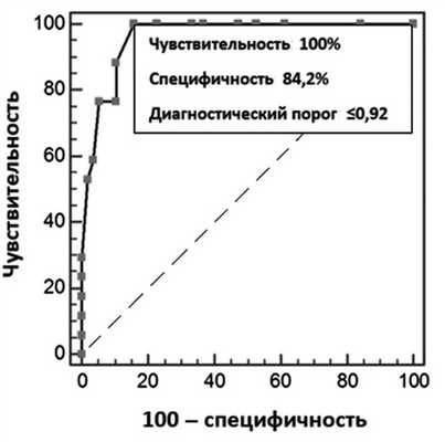 По результатам ROC-анализа площадь под кривой для метода измерения МРК составила 0,961±0,019 при 95% доверительном интервале от 0,888 до 0,992 (рис. 4), пороговое значение с наилучшими диагностическими показателями для измерения МРК — 0,92. При данном пороговом значении метод измерения МРК имел чувствительность 100% и специфичность 84%. В то же время прогностическая ценность его положительного и отрицательного результатов равнялась 65 и 100% соответственно, а диагностическая точность — 92%.