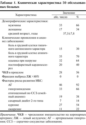 Таблица 1. Клиническая характеристика 50 обследованных больных Примечание. ЧКВ — чрескожное вмешательство на коронарных артериях; ЛЖ — левый желудочек; АГ — артериальная гипертония; ССЗ — сердечно-сосудистые заболевания.