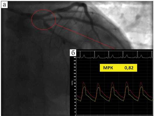 Рис. 6. Пример определения МРК у больного И., 55 лет. а — ангиограмма левой КА: устьевой 68% стеноз ОА (обведен красным кругом); б — результат определения МРК=0,82.