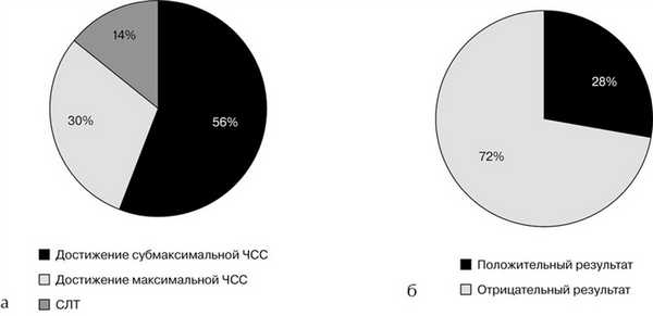 Всем 50 пациентам перед контрольной КГ и определением МРК и ФРК проведены нагрузочные тесты. Во всех случаях пробы доведены до диагностических критериев (рис. 1, а). Осложнений при проведении нагрузочных тестов не отмечено. Результат СНС-ВИМ оказался положительным у 14 (28%) больных, отрицательным у 36 (72%) (рис. 1, б).