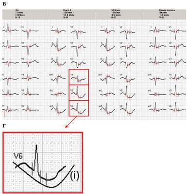 Как видно из представленных усредненных комплексов, в некоторых отведениях иллюзия положительного теста очень велика. Поэтому, несмотря на явный артефициальный характер депрессии по стандартной ЭКГ в 12 отведениях, а также типичный дрейф изолинии, визуализирующийся в левых грудных отведениях (дуга i, обозначенная на рис. 2Г), этому пациенту было проведено дообследование (перфузионная сцинтиграфия миокарда с нагрузкой, мультиспиральная компьютерная томография, стресс-эхокардиография). Диагноз ИБС был отвергнут.