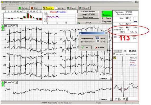Метаболический эквивалент (МЕ, МЕТs) - это показатель, косвенно отражающий активность метаболических процессов в организме путем расчета уровня метаболизма (потребления О2) при заданной нагрузке, при этом за исходную величину (1 ME) принят уровень метаболизма в покое. При наращивании нагрузки метаболизм возрастает, следовательно, количество Mets также возрастает. С учетом веса пациента все современные системы производят автоматический расчет выполненной работы по формуле 1 МЕ = 3.5 мл O2/мин/кг веса тела. Во время теста в рабочем окне программы можно видеть текущую толерантность к нагрузке (рисунок 1А), а конечный результат (Макс. Mets) выводится в окончательной таблице рабочего окна в соответствующей графе итоговой таблицы (рисунок 1Б).