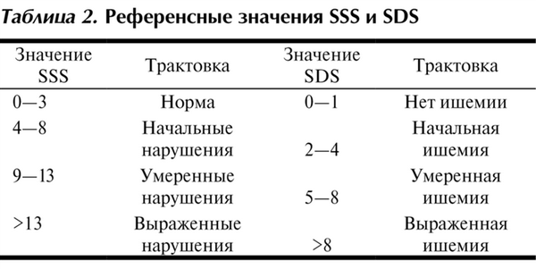 Анализ полученных данных проводили количественным методом на системах с использованием программных пакетов AutoSPECT, QPS/QGSAutoQUANТ (Cedars-SinaiMedicalCenter, Лос-Анжелес, США). При локализации зоны нарушения перфузии ЛЖ использовали стандартную 17-сегментную схему с топографическим соответствием с бассейном К.А. На конечном этапе исследования проводили оценку интегральных показателей тяжести поражения миокарда: SRS (от англ. — summedrestscore), SSS (от англ. — summedstressscore) и SDS (summeddifferencescore). Референсные значения для SSS и SDS и их трактовка приведены в табл. 2 согласно рекомендациям разработчиков данного пакета программ.