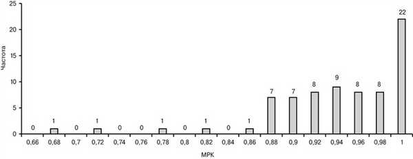 Распределение полученных значений МРК всех 74 исследуемых стенозов представлено на рис. 2. Диапазон значений МРК составил от 0,68 до 1, среднее значение МРК — 0,95 (0,9; 0,99).