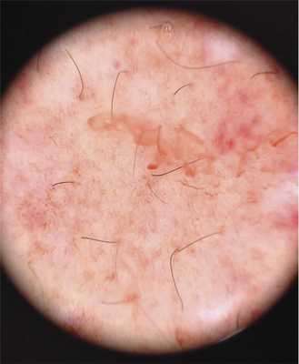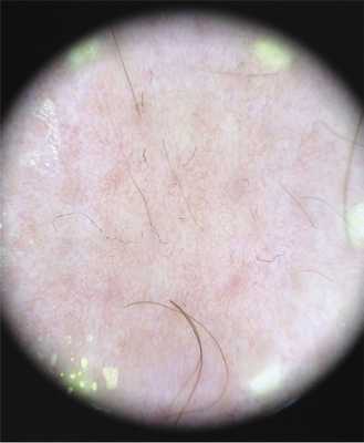 При использовании дерматоскопа визуализация структур эпидермиса и дермы до уровня сосочкового слоя происходит при устранении отражения света роговым слоем. С этой целью традиционно используют иммерсионную жидкость либо встроенный в дерматоскопическую аппаратуру источник поляризованного света и специальные фильтры [5]. В итоге для исследователя становятся видимыми структуры эпидермиса и дермы. С помощью инцизионной биопсии было доказано, что все дерматоскопически видимые структуры кожи имеют достоверную корреляцию с морфологическими признаками [10].