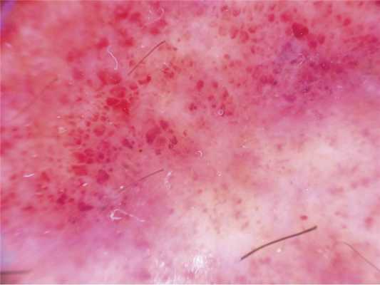 Рис. 2. Ожог IIIа степени: устья волосяных фолликулов в виде гиперемированных округлых пятен, сосуды в виде клубочков либо точек, не визуализируются линейные капилляры и капиллярная сеть.
