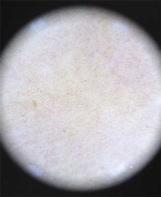 Рис. 3. Ожог IIIб степени: устья волосяных фолликулов четко не контурируются либо имеют цианотичную окраску, на общем беловато-розоватом фоне визуализируются точечные капилляры.