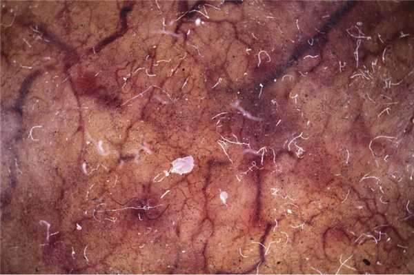 Использование дерматоскопической аппаратуры в обследовании ожогов позволило визуализировать следующие структуры кожи: неповрежденная кожа имела желтоватый цвет с характерным кожным рисунком, четко очерченными устьями сальных желез в местах их максимального скопления, волосяных фолликулов с пушковыми или длинными волосами.
