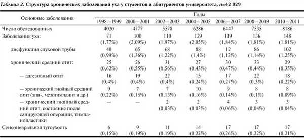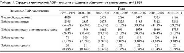 (42 829), можно констатировать значительное распространение хронических заболеваний ЛОР-органов у молодых (табл. 1). Довольно часто диагностированные нами заболевания ЛОР-органов можно было расценить как впервые выявленные, так как в представленной при поступлении «форме 86-у» в графе «Состояние ЛОР-органов» имелась запись: «практически здоров; слух - N». В структуре хронической ЛОР-заболеваемости патология уха стояла на 3-м месте, уступая 1-е и 2-е места патологии глотки, носа и околоносовых пазух, и встречалась в разные годы от 1,77% случаев в 1998/1999 гг. до 2,09% - в 2000/2001 гг.