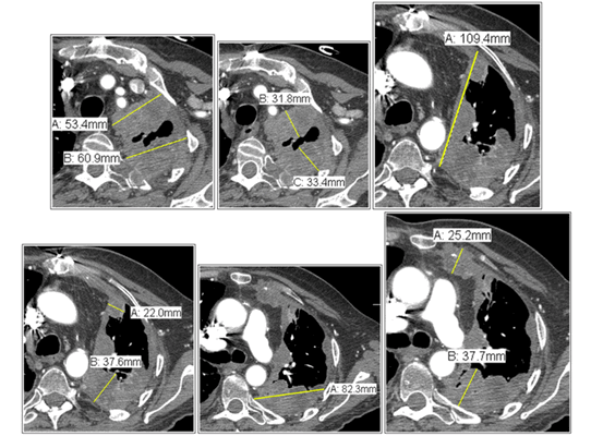 Рекомендации по измерению согласно mRECIST нужно оценить толщину плевры на 3 разных по глубине аксиальных срезах в 2 противоположных сторонах, а после сложить данные 6 показателей следующим образом общий размер равен 3.2 + 3.3 + 2.2 + 3.8 + 2.5 + 3.8 = 18.8 см.