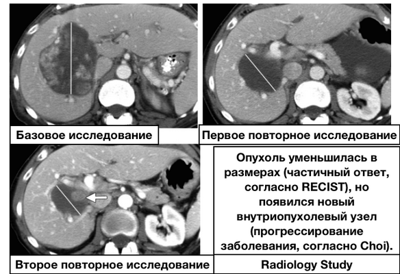 Таким образом, оценка уровня ответа опухоли в критериях H. Choi зависит не только от размеров очагов. Это особенно важно при ГИСО, так как зачастую возможно выявить прогрессирование заболевания при сохранении и даже уменьшении анатомических размеров очагов.